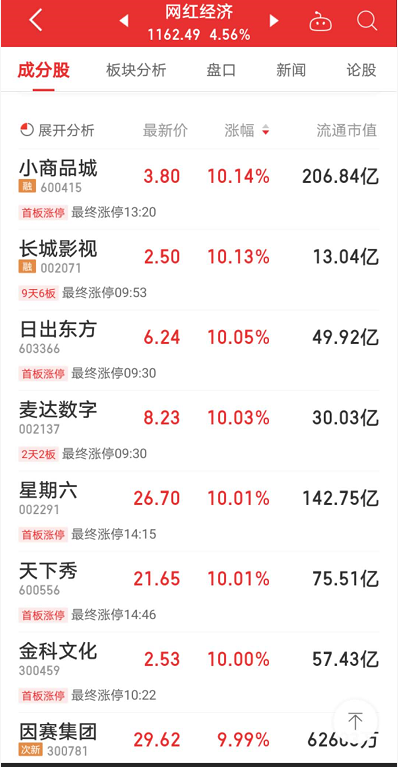 同样火爆的还有资本市场上的网红经济概念股。据证券时报·数据宝统计,网红经济概念股年内已有7股涨幅超过50%,分别是省广集团、壹网壹创、南极电商、天下秀、梦洁股份、芒果超媒、立昂技术等,省广集团累计涨幅206.97%遥遥领先。