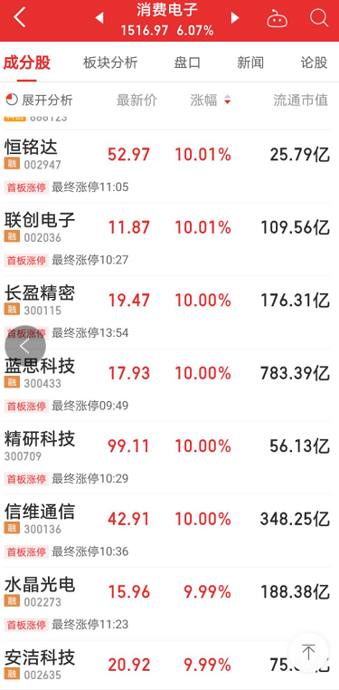 苹果的大卖,也传导至资本市场。今日以手机产业链为主的科技题材如消费电子、无线耳机、苹果概念、5G概念、华为概念等上演涨停潮,其中消费电子指数大涨超6%,成为今日最强题材,题材龙头蓝思科技、长盈精密、信维通信、联创电子等涨停。