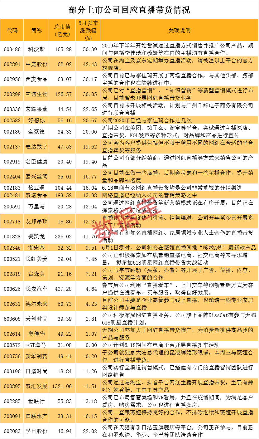在直播带货爆火的同时,在互动平台上,投资者关于此类话题的提问开始增多。据不完全统计,近一周时间内,已有超30家公司就直播带货类话题进行回复。就在今日晚间,双汇发展在回答投资者提问时表示,公司通过与淘宝、抖音平台网红主播开展直播带货,主要有辣香肠、王中王等产品,下一步公司将聚焦重点产品,持续加强线上线下联合营销力度,增强品牌的美誉度和影响力。