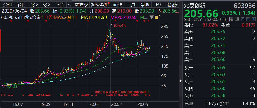 兆易创新2019年的财务数据表现亮眼,营业收入为32.03亿元,同比增长42.62%;归属于上市公司股东的净利润6.07亿元,同比增长49.85%。自2019年起,兆易创新股价大幅上涨,自50元最高涨至今年2月的305元,此后股价有所调整,昨日收盘价为205.66元,期间涨幅超过3倍。