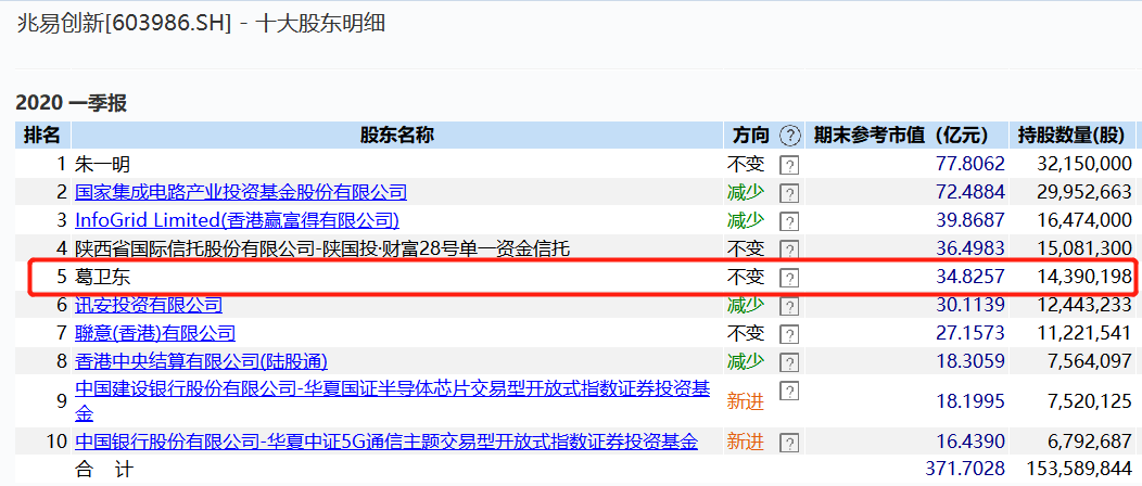 葛卫东2019年三季报起进入兆易创新前十大股东,此后持股一直都没有变化。据一季报数据,葛卫东持股兆易创新1439万股,为该公司第5大股东,期末参考市值为34.83亿元。