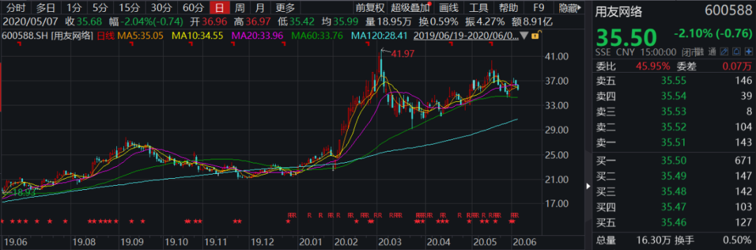 用友网络是葛卫东投资科技股的另一成功案例,葛卫东从2017年三季度开始大举买入该公司,当时的股价约在9元左右(前复权价)。在2018年一季度完成建仓,当时股价出现大幅上涨,价格在9元到19元之间(前复权价)。综合计算,葛卫东的平均建仓成本低于13元。用友网络股价今年一季度大幅飙升,2月涨幅高达41.8%,该公司昨日股价为35.5元,葛卫东每股浮盈超过20元,仅在用友网络这一家公司,其浮盈超过20亿元。