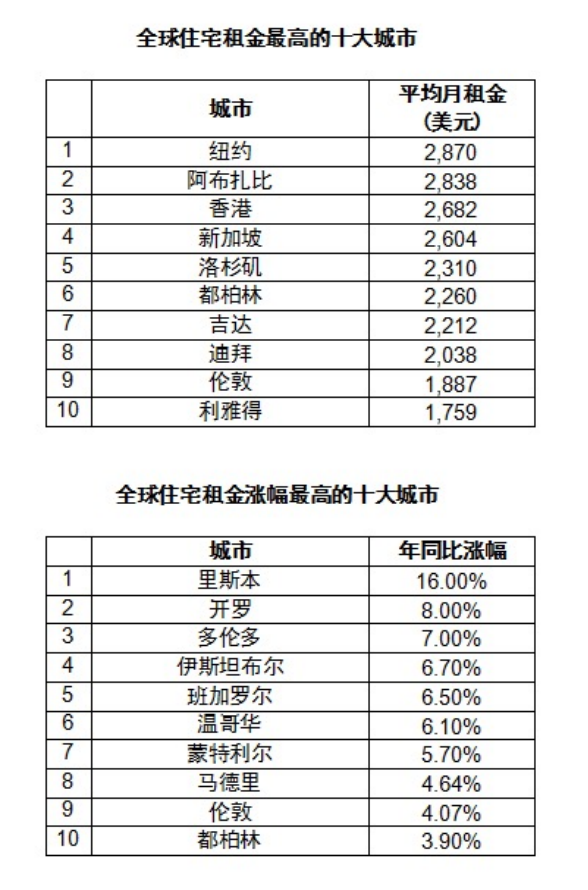 从租赁市场来看,十大房租最贵城市榜单中的四席均被中东城市占据,其中中国香港排名第三,而纽约和里斯本分别占据住宅租金和租金涨幅榜的榜首。