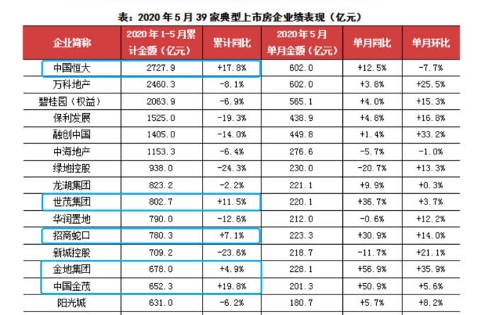 与此同时,据克而瑞发布的最新数据显示,2020年5月,市场持续复苏,百强房企销售进一步恢复。TOP100房企单月实现全口径销售金额10915.4亿元,环比增长21.3%,同比增速自4月转正后进一步显著提升至12.2%。与去年全年的月均销售相比,5月百强房企单月全口径业绩也提升近13%。从累计业绩来看,2020年1-5月TOP100房企累计全口径业绩同比下降7.9%,但降幅自3月以来继续收窄。整体而言,市场及企业销售表现均持续向好。