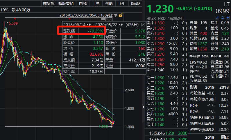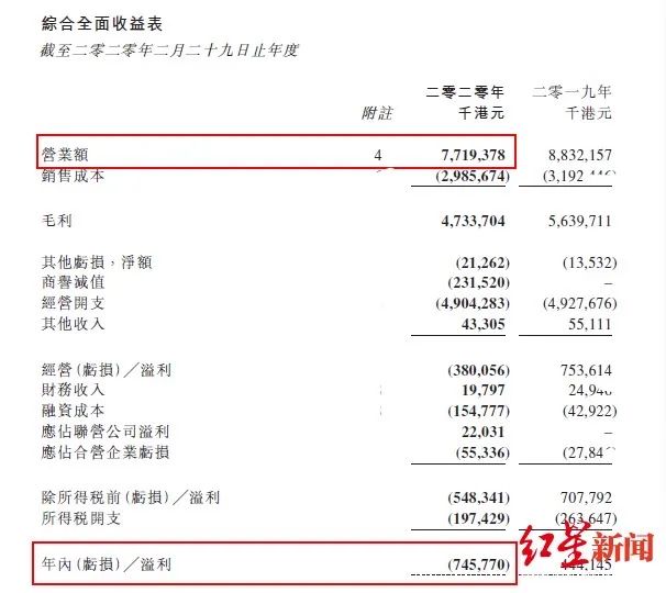 日前,I.T(00999.HK)发布2019年度财务报告显示,报告期内,公司营收77.19亿港元,同比减少12.6%;毛利为47.34亿港元,同比减少16.1%;净利润则首次出现年度亏损7.46亿港元。相对于2018-19年度全年纯利4.44亿元,由盈转亏。