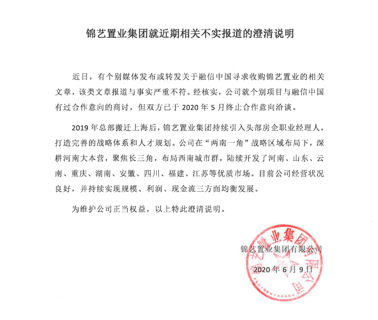 消息蔓延开来,融信给锦艺置业的合作方们发了一份澄清函,声明融信与锦艺置业只是在个别项目上有过合作商讨,2020年5月双方已终止合作洽谈。