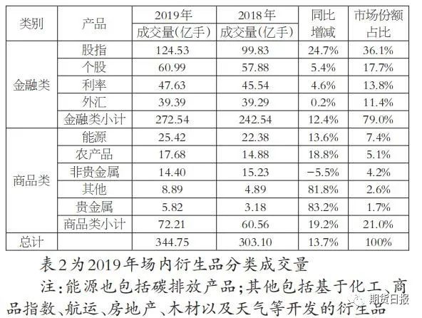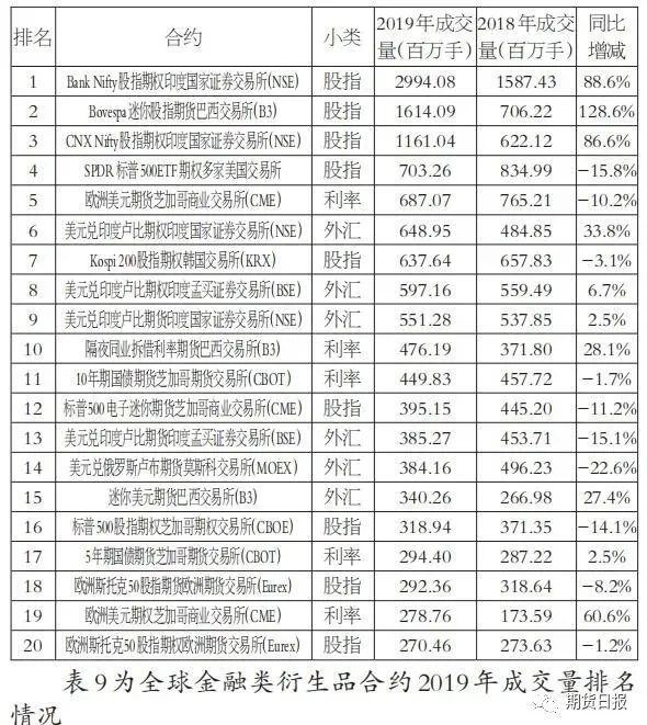 2019年,成交手数排名全球前3位的金融类衍生品合约均为股指类,依次为印度国家证券交易所的Bank Nifty股指期权、巴西交易所的Bovespa迷你股指期货和印度国家证券交易所的CNXNifty股指期权。排名前20的金融类衍生品中,10个为期权,10个为期货。从具体分类来看,9个为股指类,6个为外汇类,5个为利率类。(作者单位:大连商品交易所)