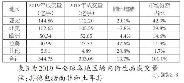 FIA发布的2019年全球80余家交易所上市的近2900个场内衍生品的交易数据,仅包含2019年和2018年有成交发生的上市品种,数据显示,2019年全球期货与期权成交量为344.75亿手,较2018年增长13.7%,创建新的历史记录。新兴市场的中国、印度、和巴西较2018年分别增长了30.8%、44.9%和50.8%,成为推动全球成交量创建历史新高的主要动力。
