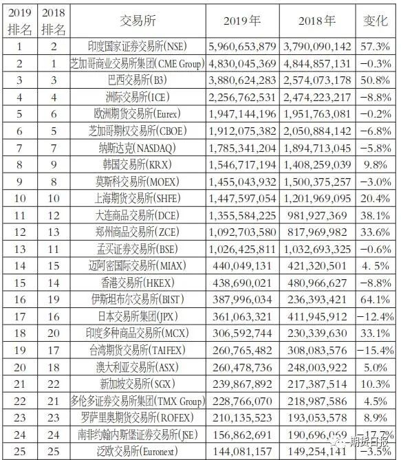 2019年全球交易所成交排名较以往出现了明显变化。按场内衍生品成交手数计算,2019年全球排名前3的交易所为NSE、CME集团和巴西交易所(B3)。其中,NSE首次超越CME集团位居第1,成交量为59.61亿手,同比增长57.3%。这主要是受到其Bank Nifty股指期权成交大幅增加的推动,该期权是目前全球成交量最大的场内金融类衍生品,2019年成交29.94亿手,同比增幅88.6%,占NSE衍生品总成交量的50.2%。