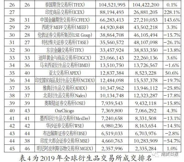 中国内地多家期货交易所的成交排名出现了不同程度的提升。上海期货交易所(下称上期所)排名第10,较2018年排名持平;大连商品交易所(下称大商所)排名第11,较2018年提升了1个名次。郑州商品交易所(下称郑商所)排名第12,较2018年提升了1个名次。中国金融期货交易所(下称中金所)排名第28,较2018年提升了3个名次。