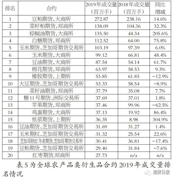 2019年,成交手数排名全球前4位的农产品衍生品分别为大商所的豆粕期货、郑商所的菜籽粕期货、大商所的棕榈油期货和郑商所的白糖期货。