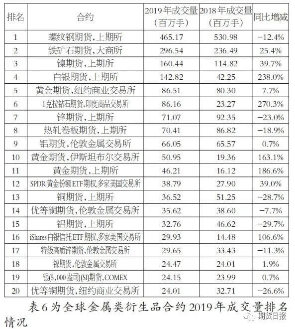 2019年,成交手数排名全球前4位的金属类衍生品分别为上期所的螺纹钢期货、大商所的铁矿石期货、上期所的镍和白银期货。