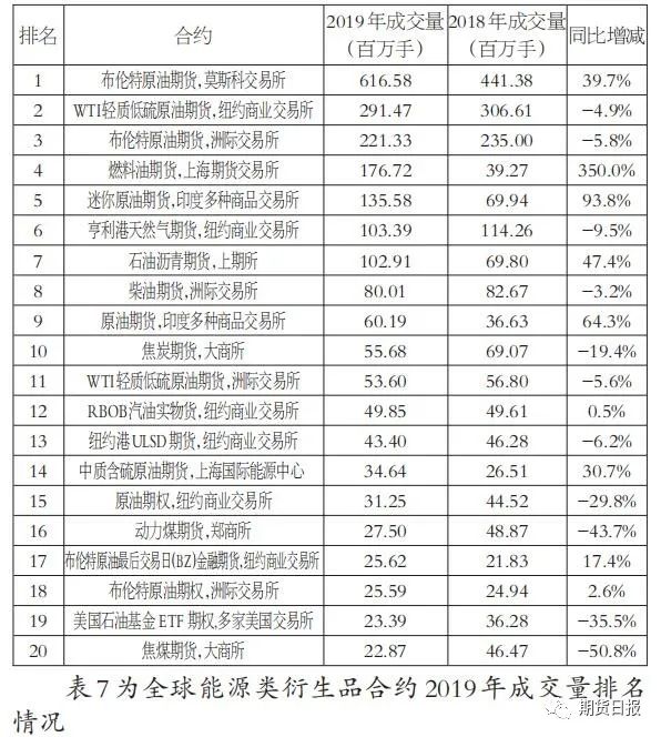 2019年,成交手数排名全球前3位的能源类衍生品分别为莫斯科交易所(MOEX)的布伦特原油期货、纽约商业交易所(NYMEX)的WTI原油期货和ICE的布伦特原油期货。