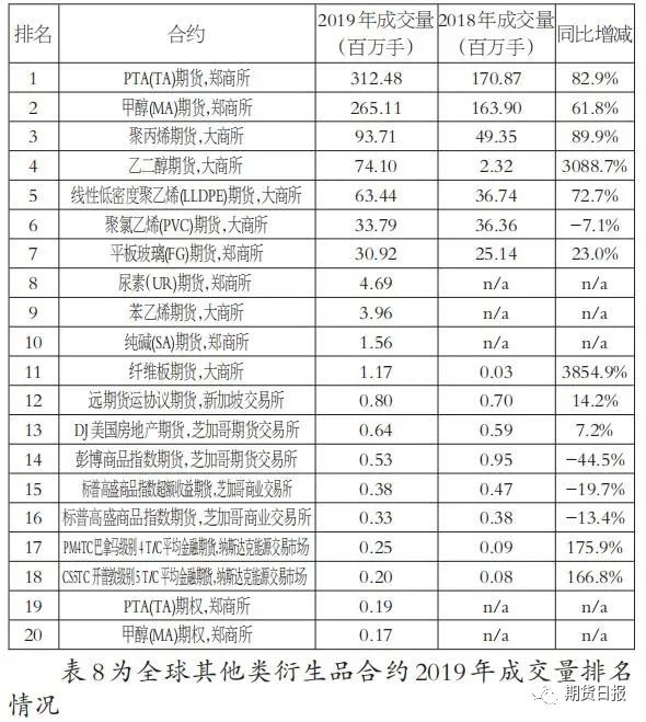 FIA排名中的其他类衍生品主要包括除上述类别外的其他商品衍生品,例如化工、商品指数、航运、房地产、木材以及天气等。2019年,成交手数排名全球前3位的其他类衍生品依次为郑商所的PTA期货、甲醇期货和大商所的聚丙烯(PP)期货。排名前15的其他类衍生品中,大商所的纤维板、乙二醇、聚丙烯品种包揽了增幅榜的前3名,增幅依次为3854.9%、3088.7%和89.9%。