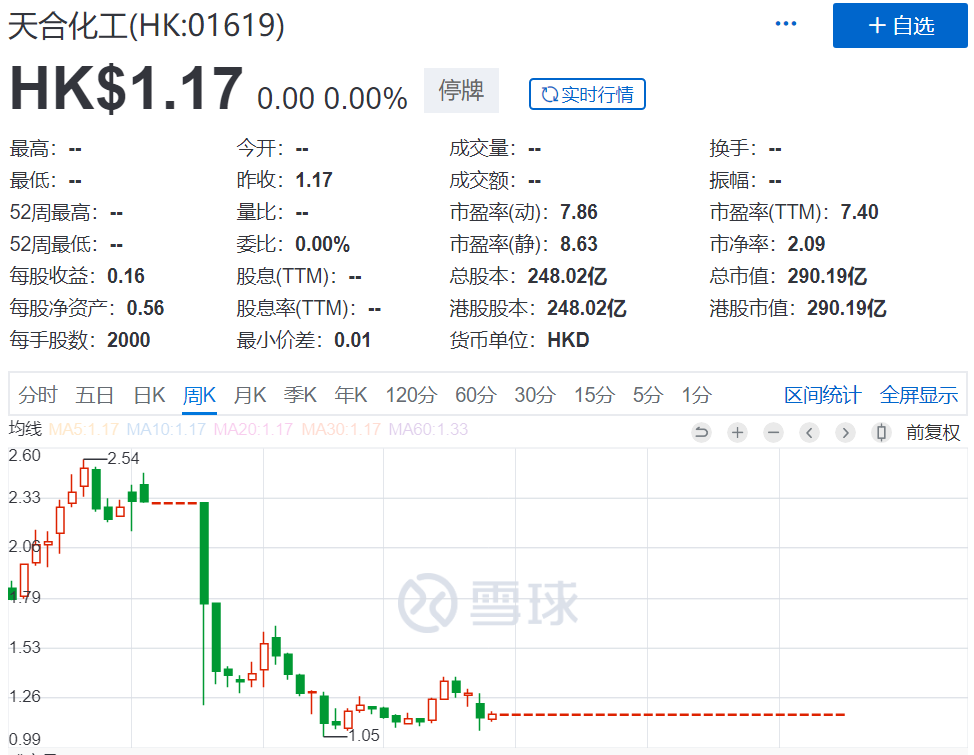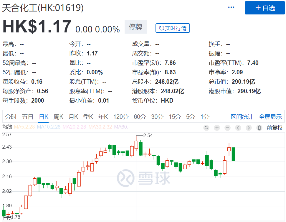 上市之后,天合化工的股价异常强势,从1.55港元的发行价一路攀升至2.54港元,仅用了2个月时间,累计涨幅超35%,其总市值也一度高达630亿港元。