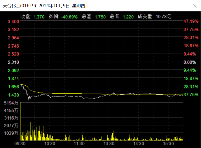 此后,天合化工彻底崩塌,2014年12月,其股价一度跌至1.05港元,较最高点跌去58.7%。