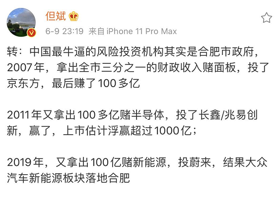 私募大佬在微博转了一条段子,是这么说的:转:中国最牛逼的风险投资机构其实是合肥市政府,2007年,拿出全市三分之一的财政收入赌面板,投了京东方,最后赚了100多亿2011年又拿出100多亿赌半导体,投了长鑫/兆易创新,赢了,上市估计浮赢超过1000亿;2019年,又拿出100亿赌新能源,投蔚来,结果大众汽车新能源板块落地合肥
