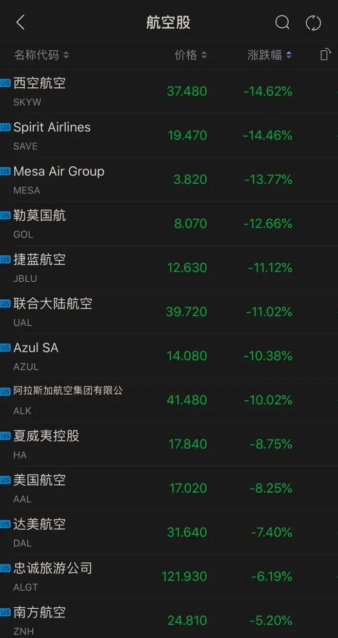 当地时间本周三,西南航空、美国联合航空均跌超10%,美国航空跌8.25%,达美航空跌7.4%。