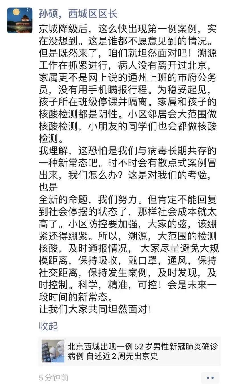 △北京市西城区区长6月11日发了条朋友圈