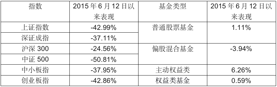 WIND资讯数据显示,剔除运作不满5年的基金,且分级基金仅算母基金,将权益基金分为普通股票基金、偏股混合基金、主动权益类(包括普通股票型、偏股混合型、平衡混合型、偏债混合型、灵活配置型)、权益类基金(含主动和被动)这四类来看,2015年6月12日以来表现不俗,分别有1.11%、-3.94%、6.26%、0.59%的收益。显示出公募基金在投资上的具有明显优势,也确实炒股不如买基金。