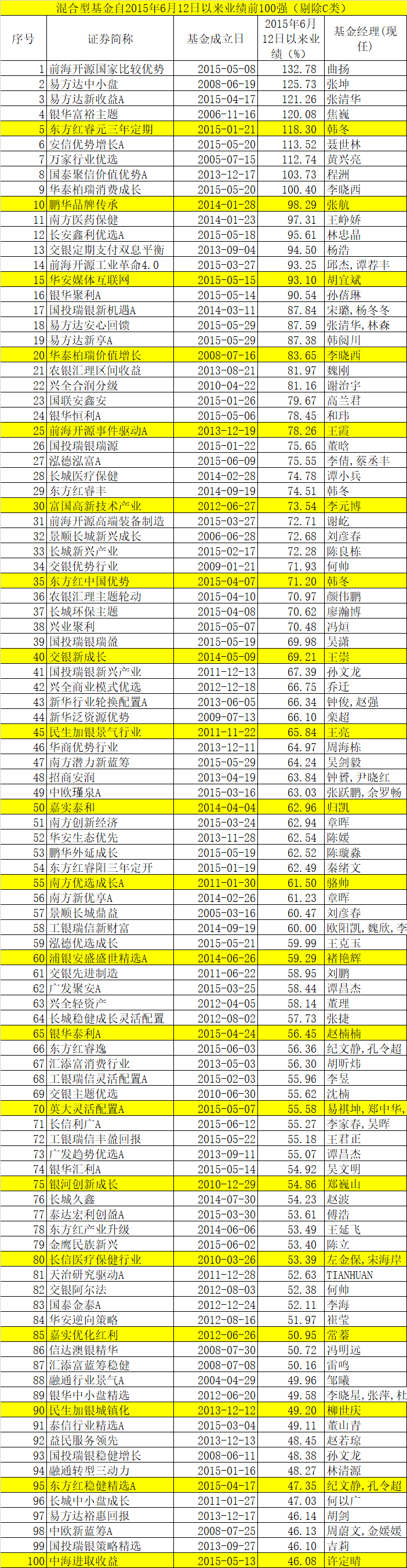 而在混合型基金中,收益超越100%的更多。前海开源国家比较优势、易方达中小盘、易方达新收益A、银华富裕主题、东方红睿元三年定期、安信优势增长A、万家行业优选、国泰聚信价值优势A、华泰柏瑞消费成长等收益率均超过100%。