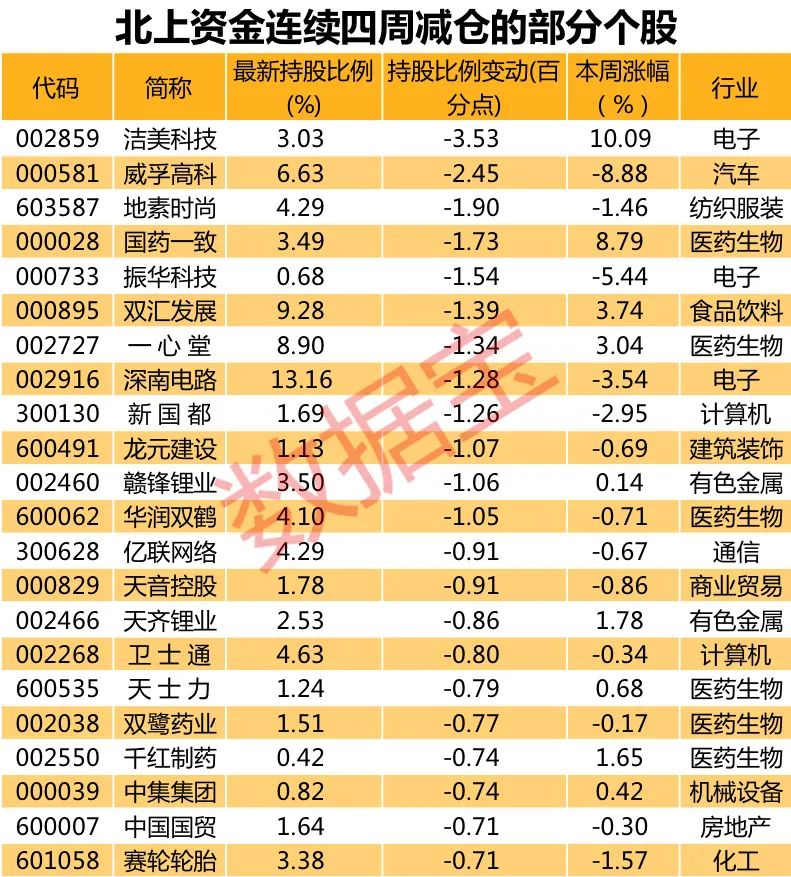 从市场表现来看,北上资金连续四周减仓的股票中,本周有25股股价上涨。涨幅最大为百联股份,本周上涨20.58%,涨幅较大的还有*ST京城、洁美科技、人福医药等。