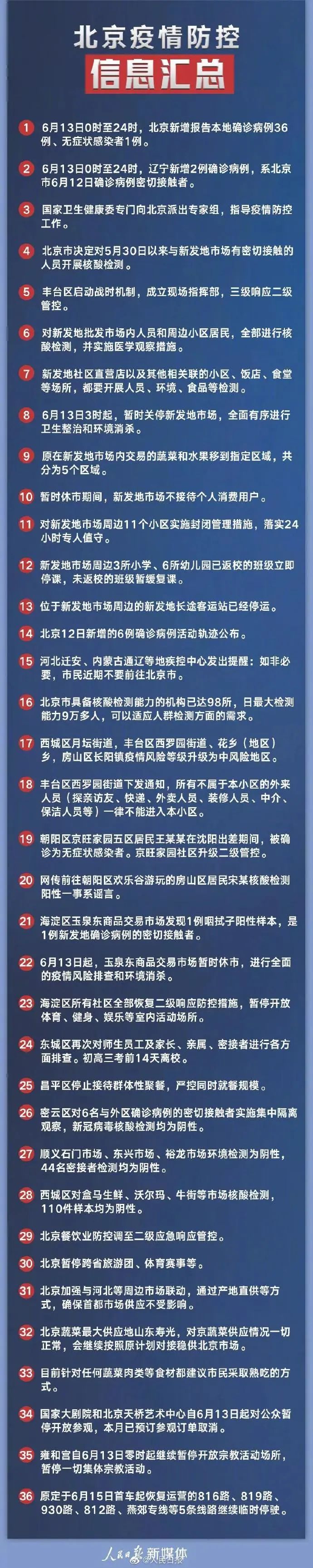 6月13日0—24时,北京市新增新冠肺炎确诊病例36例,其中11人自述近14天无任何症状,1人自述近期除失眠外无任何不适症状。