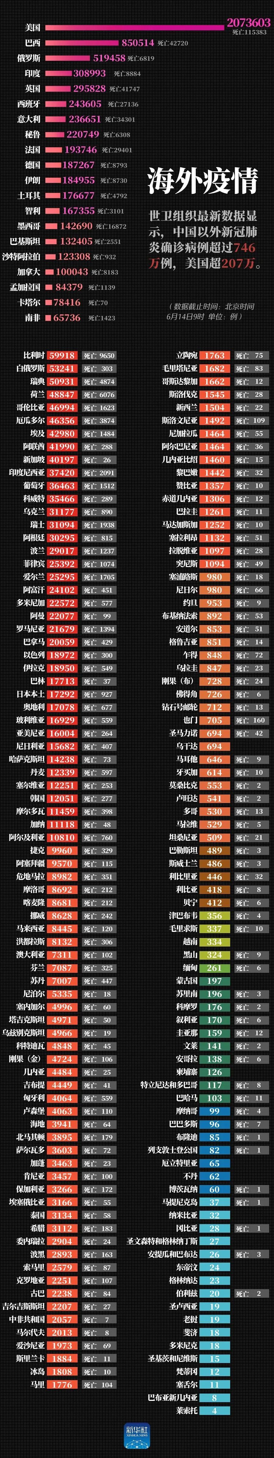 美国约翰斯·霍普金斯大学发布的实时统计数据显示,截至北京时间6月14日15时左右,全球累计确诊新冠肺炎病例778.7万例,累计死亡43万例。