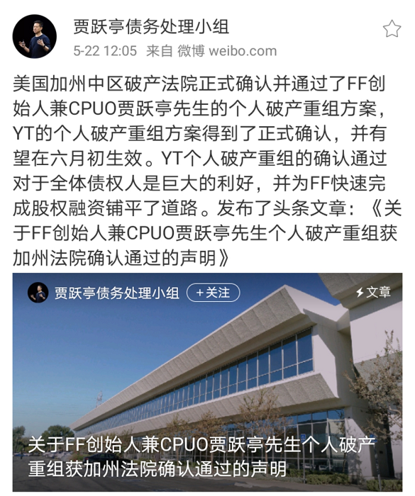5月22日,据债务处理小组称,洛杉矶当地时间5月21日,美国加州中区破产法院正式确认并通过了贾跃亭的个人破产重组方案。在获得了对该计划进行投票的债权人的压倒性多数支持,并克服了极少数债权人的反对意见之后,贾跃亭的个人破产重组方案得到了正式确认,并有望在六月初生效。