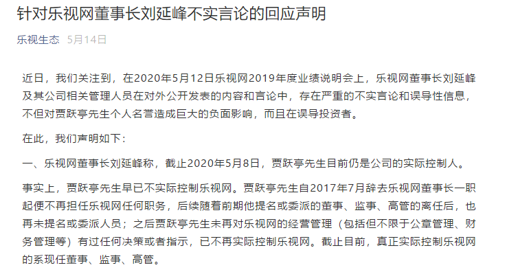 此后,乐视控股官方公众号乐视生态发布声明称,贾跃亭早已不是乐视网的实际控制人,真正实际控制乐视网的系现任董事、监事、高管。另外,对于乐视网所言“乐视网与大股东及关联方债务处理没有任何进展”,该声明也提出,该描述与事实严重不符。乐视控股称,关于乐视网董事长刘延峰及其公司相关负责人发布的不实信息和误导性言论,求其尽快面对大众及监管部门澄清事实。