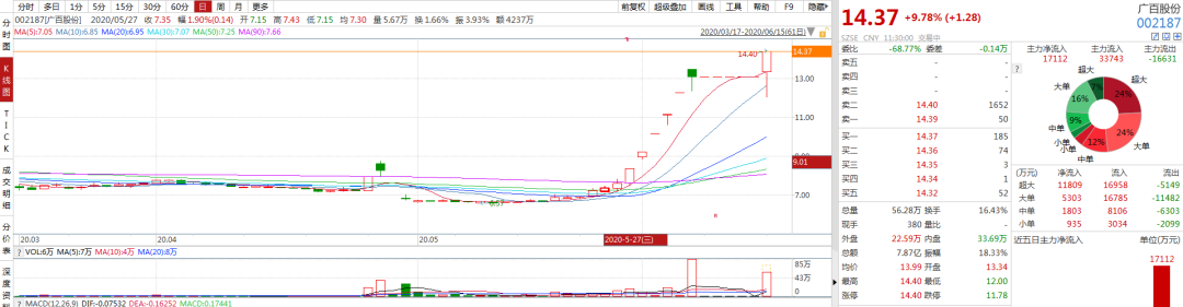 随后,广百股份迅速走高,不到十点就已封在涨停板,此后虽然频频开板、封板,再开板,再封板,但截至中午收盘,公司股价依然为14.37元/股,涨幅为9.78%。