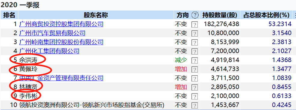 如余洪涛,至一季度末,他还是广百股份最大的自然人股东,持股比例1.44%,然而至6月5日,前十大股东榜中已找不到他的身影。