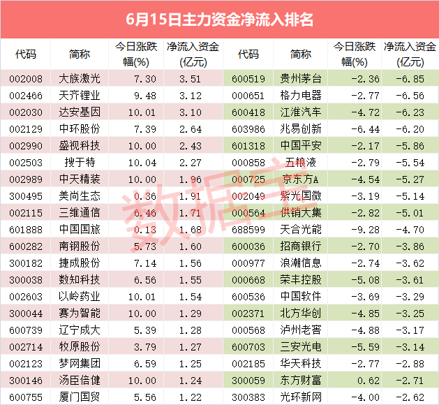 天齐锂业、达安基因全天净流入资金分别为3.12亿元、3.1亿元,两股分别上涨9.48%、10.01%。在主力资金净流入额居前的20股中,今日收盘股价全线飘红,其中搜于特、以岭药业、达安基因、盛视科技、汤臣倍健、中天精装、赛为智能涨停。