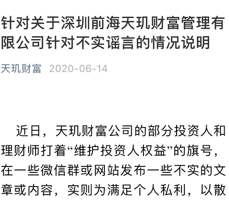 6月14日,天玑财富发文《关于深圳前海天玑财富管理有限公司针对不实谣言的情况说明》,称近日,天玑财富公司的部分投资人和理财师打着“维护投资人权益”的旗号,在一些微信群或网站发布一些不实的文章或内容,实则为满足个人私利,以散布不实言论的方式要挟公司对其优先私兑。