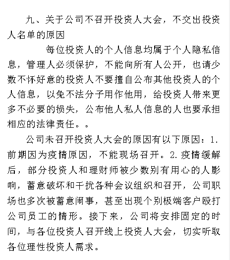 2.疫情缓解后,部分投资人和理财师被少数别有用心的人影响,蓄意破坏和干扰各种会议组织和召开,公司职场也多次被蓄意闹事,甚至出现个别极端客户殴打公司员工的情形。接下来,公司将安排固定的时间,与各位投资人召开线上投资人大会,切实听取各位理性投资人需求。