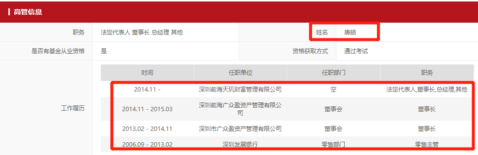 彼时,唐皓表示,其财富管理、投资管理团队成员大部分来自国内知名银行证券等大型机构,专业实力强硬,为天玑财富的商业版图和战略构想提供了强有力的支撑。