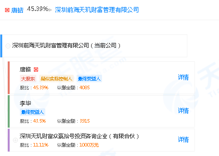 同时,天眼查数据显示,实控人也是唐皓,出资4085万元,为公司最终受益人;李毕出资3915万元,位居其后;深圳天玑财富众赢拾号投资咨询企业则出资1000万元。
