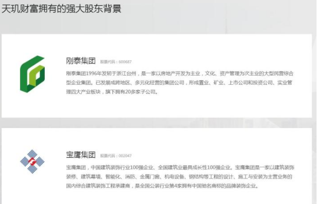 天玑财富分别在2015-2016年期间,引入两家上市公司刚泰控股和宝鹰股份成为其股东。用他的话说“两家上市公司的引入为天玑财富长远发展奠定坚实基础”。