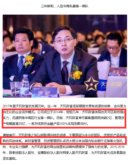 公开资料显示,天玑财富2018年初单月募集量频频突破2亿,管理资产规模直逼30亿。而最新报道则称规模已经数百亿。