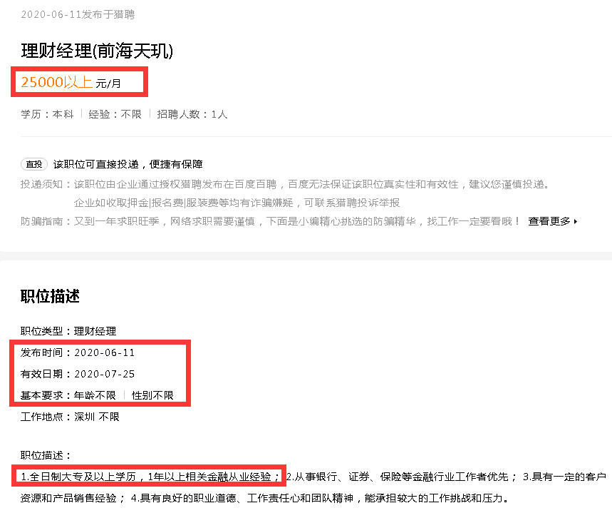 不过,招聘网站上显示,天玑财富仍在高薪招聘。如6月11日放出的“理财经理”一职,要求大专以上学历,有1年以上相关金融从业经验,薪资开到25000以上元/元。