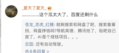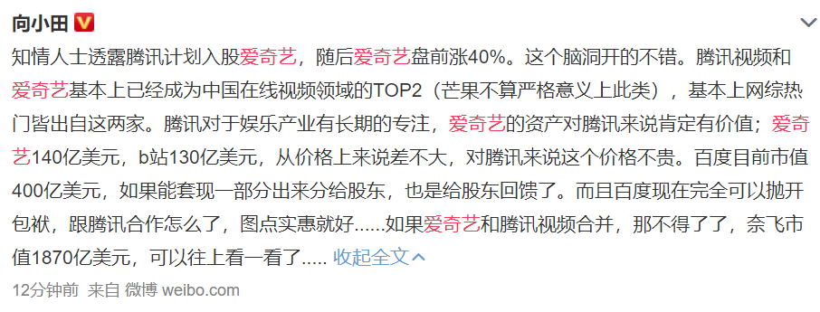 大V向小田评论称,腾讯视频和爱奇艺基本上已经成为中国在线视频领域的TOP2(芒果不算严格意义上此类),基本上网综热门皆出自这两家。腾讯对于娱乐产业有长期的专注,爱奇艺的资产对腾讯来说肯定有价值;爱奇艺140亿美元,b站130亿美元,从价格上来说差不大,对腾讯来说这个价格不贵。百度目前市值400亿美元,如果能套现一部分出来分给股东,也是给股东回馈了。而且百度现在完全可以抛开包袱,跟腾讯合作怎么了,图点实惠就好......如果爱奇艺和腾讯视频合并,那不得了了,奈飞市值1870亿美元,可以往上看一看了