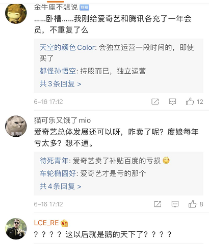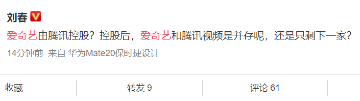 大V刘春则有疑问,控股后,爱奇艺和腾讯视频是并存呢,还是只剩下一家?