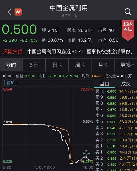 中国金属利用午后惨遭洗仓,股价一度闪崩超90%。截至收盘,股价跌幅82.7%,报0.5港元,成为港股又一只股价在1港元以下的“仙股”。成交7434.90万港元,股价创上市以来新低,直接抹去近63亿港元市值。