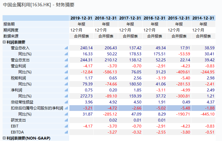 而从财报来看,中国金属利用上市后就没有实现盈利,一直处于亏损状态。最新的2019年财报显示,虽然全年实现营收240亿元,同比增加16.33%,但扣非净利润实现亏损3.21亿元。