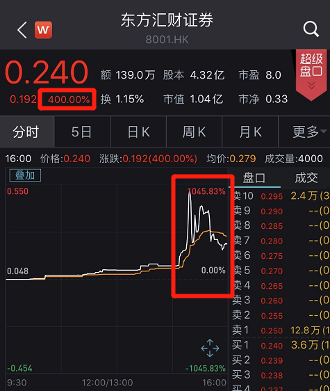 午后,东方汇财证券一度暴涨1045.83%,股价从不足0.1港元涨至0.55港元。
