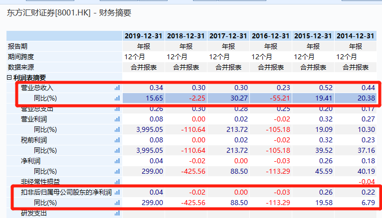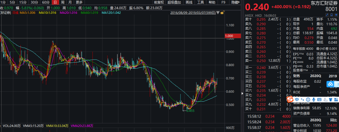 消息面上,东方汇财证券2019年扭亏为盈,2019年盈利454.6万港元,上年同期亏损209.7万港元;营业总收入3432.5万港元,同比增长16.0%。