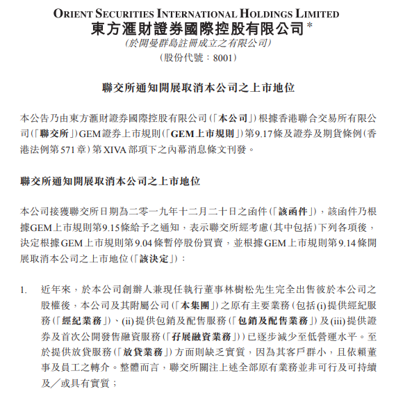 而在去年底,东方汇财证券曾接获联交所通知取消公司上市地位。