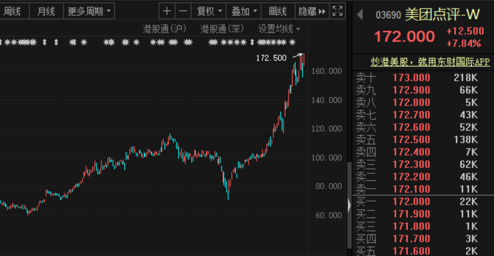 将时间拉长来看,美团从今年3月19日阶段低点70.1港元开始,截至最新期间累计涨幅最高达146.08%。与此同时,美团市值也水涨船高,期间总市值飙升6811.58亿港元。
