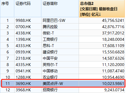 按照最新总市值排名,美团在港股排名为仅次于阿里、腾讯的第三大“万亿”互联网上市公司。