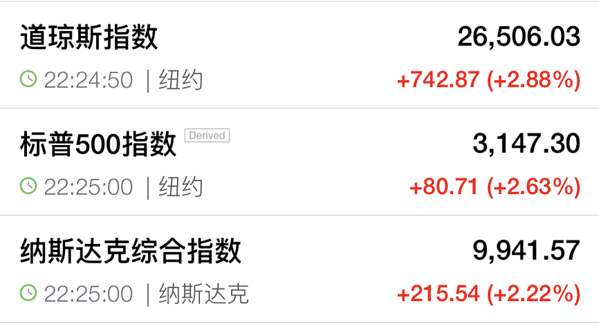 或受此影响,美股再度大涨,截至16日22:25分左右,道指大涨逾700多点,标普500涨超2.6%,纳指涨逾2%。